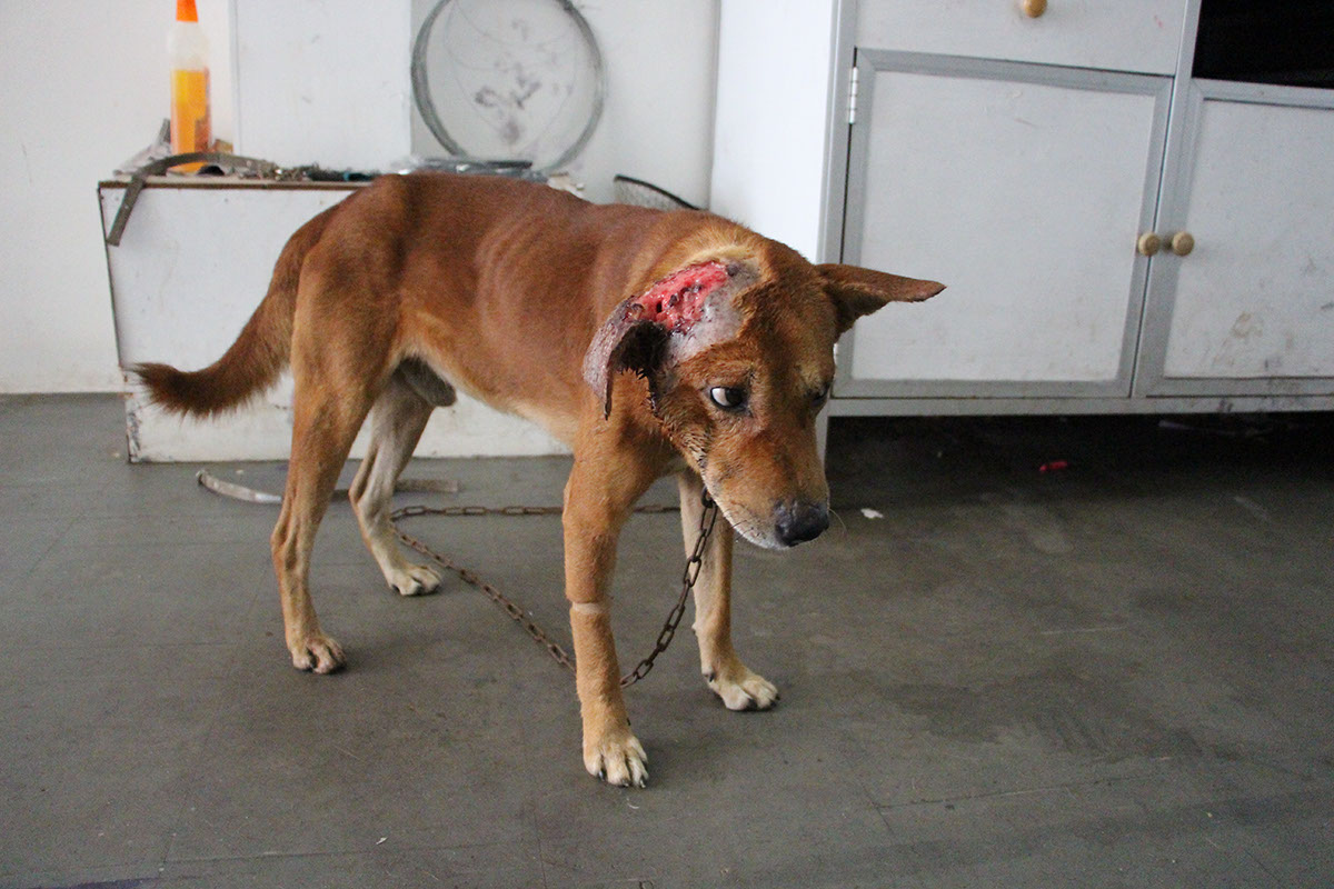 Rescued from Panagoda, Broony aka Pana, was brought with a deep wound on the ear which was maggot infested. He appeared to be a dog who previously had a home and had been abandoned, most likely due to his injury.