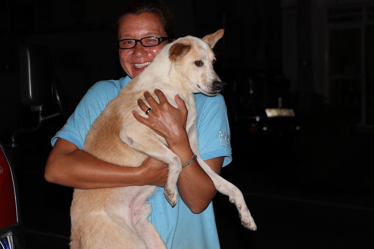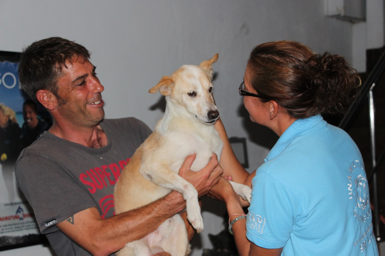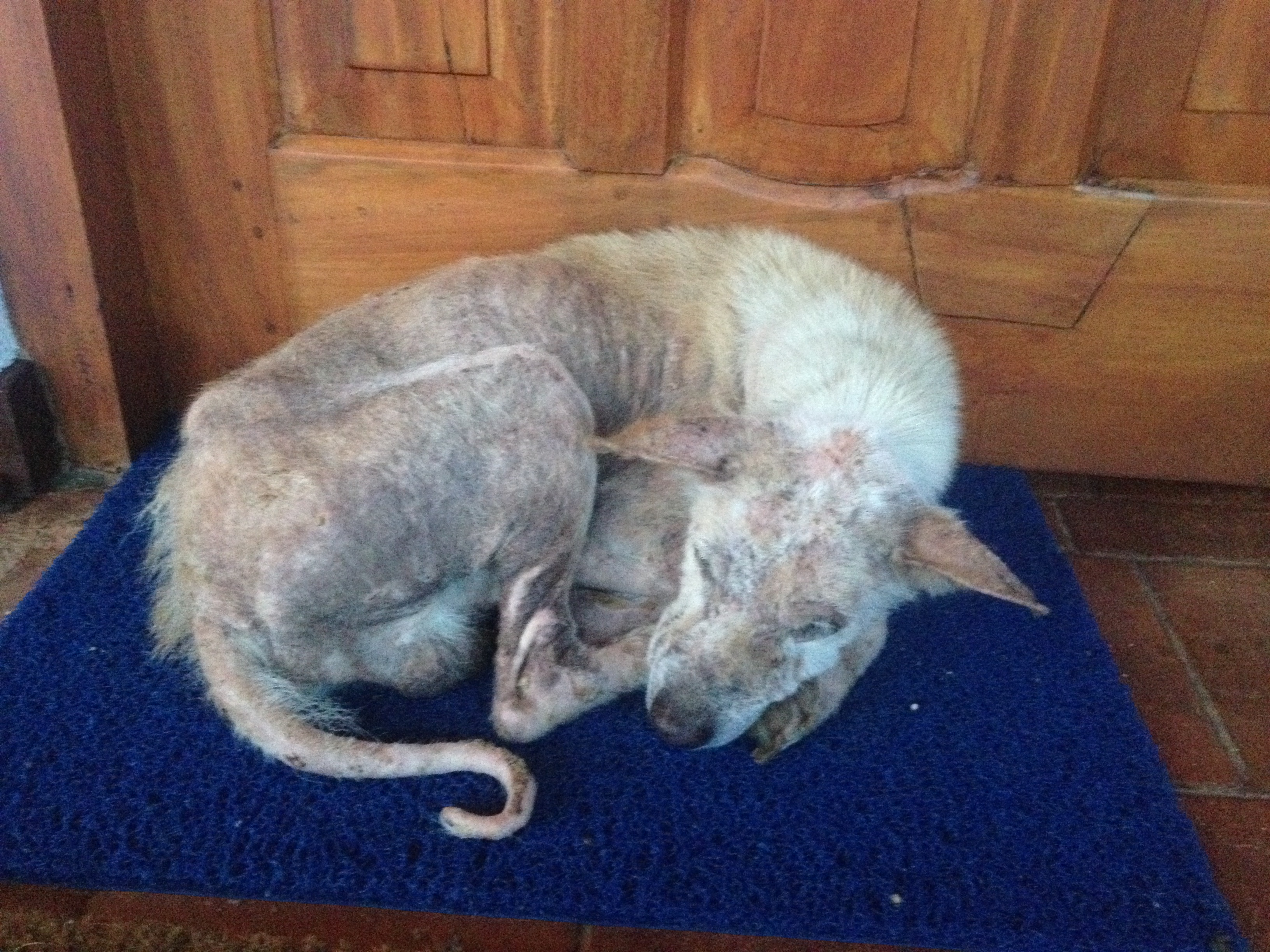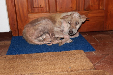 Nick and Trisha, two diving instructors moved to Unawatuna last year. They noticed a scruffylooking dog who had no fur roaming around the premises. They contacted us and we went all the way to Unawatuna to pick this guy up.