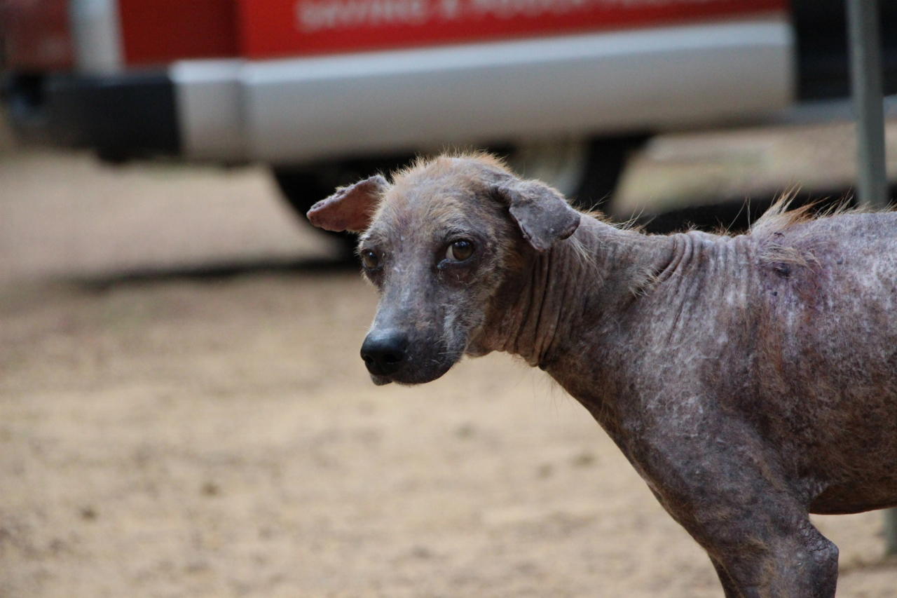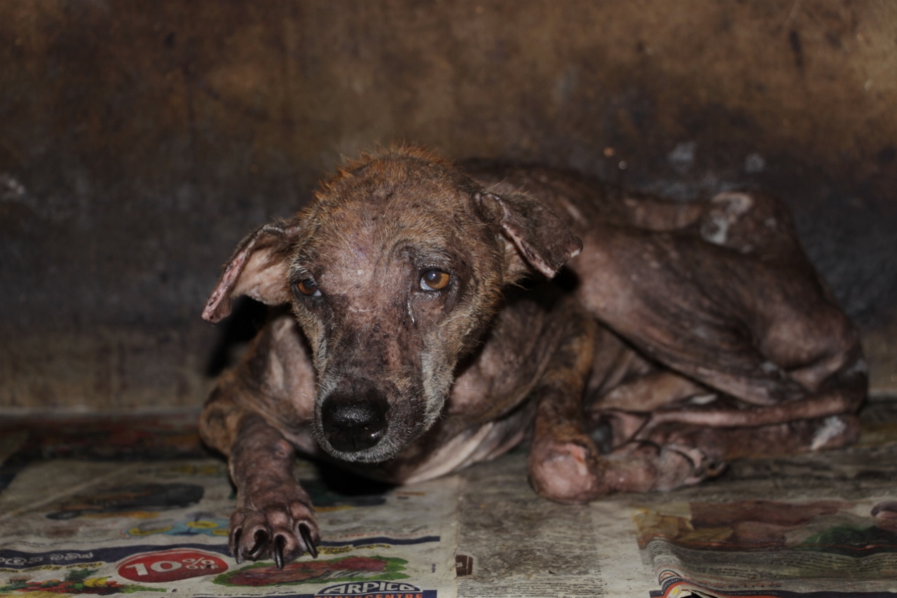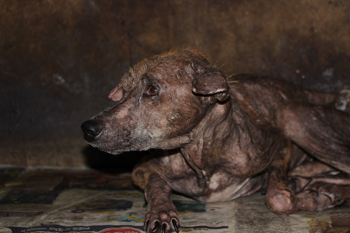 He was emaciated and without any fur but with care and treatment, he grew to be a beautiful dog.